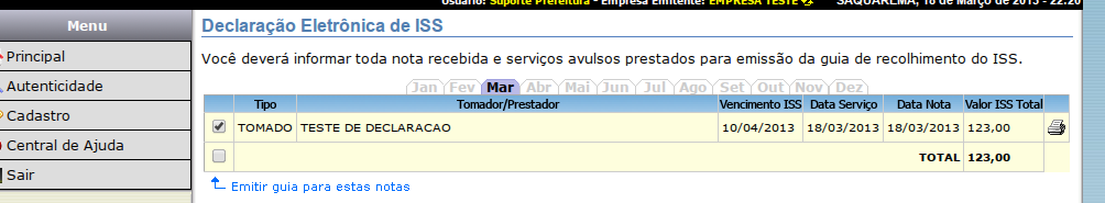 5) Na tela de declarações, você verá as declarações efetuadas, e poderá gerar a guia de ISS para elas, exatamente como na NFS-e. Selecione as declarações que você deseja pagar, e clique em "Emitir guia para estas declarações".
